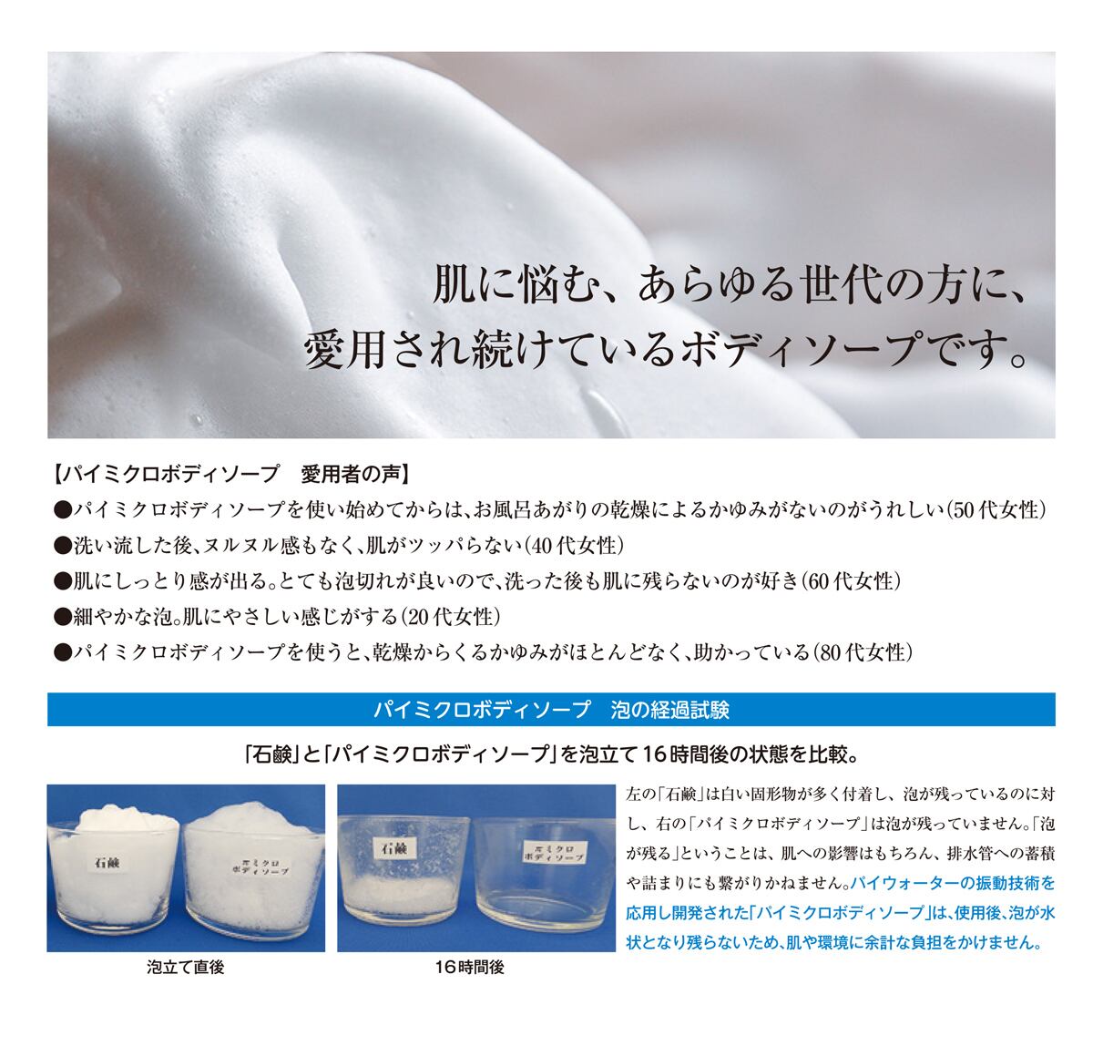 ○クリーミーできめ細やかな泡。ソフトに汚れを落とします。
