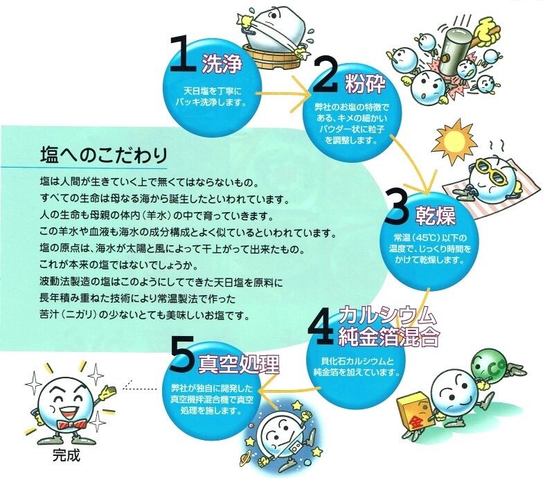 原材料名:天日塩(メキシコ)、さんごカルシウム、金箔