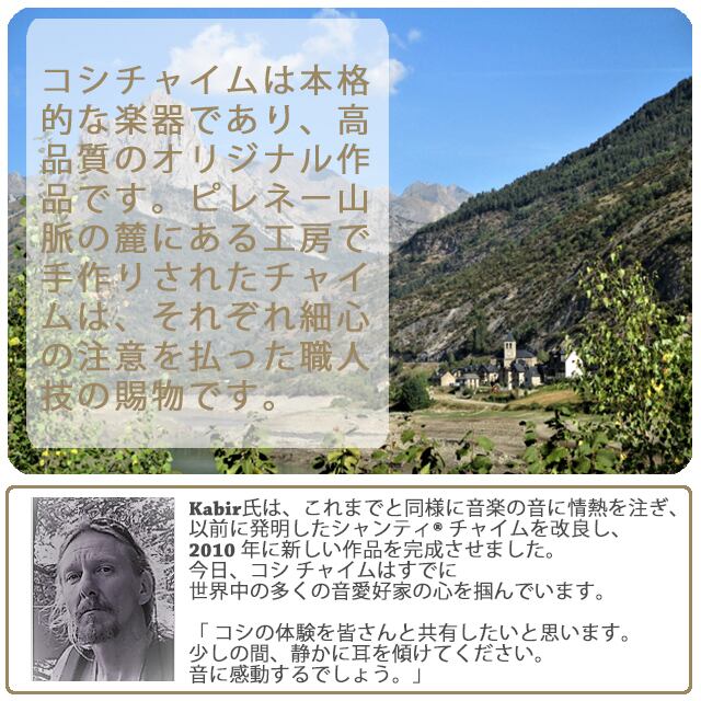 コシチャイムは音が深く、倍音が豊かで、長い響きが特徴です。