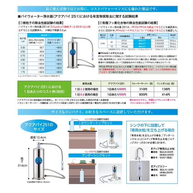 「大切な人の健康のため、安心で安全な暮らしを実現するために、一生付き合っていける水がほしい」。水を大切に生活している人に選ばれている浄水器。アクアパイ251が健康で快適な水のある暮らしを支えていきます。
